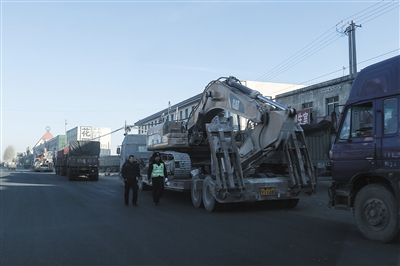 昨日,102国道三河市段甲岭镇路段停着四五辆重型机械。新京报记者 彭子洋 摄