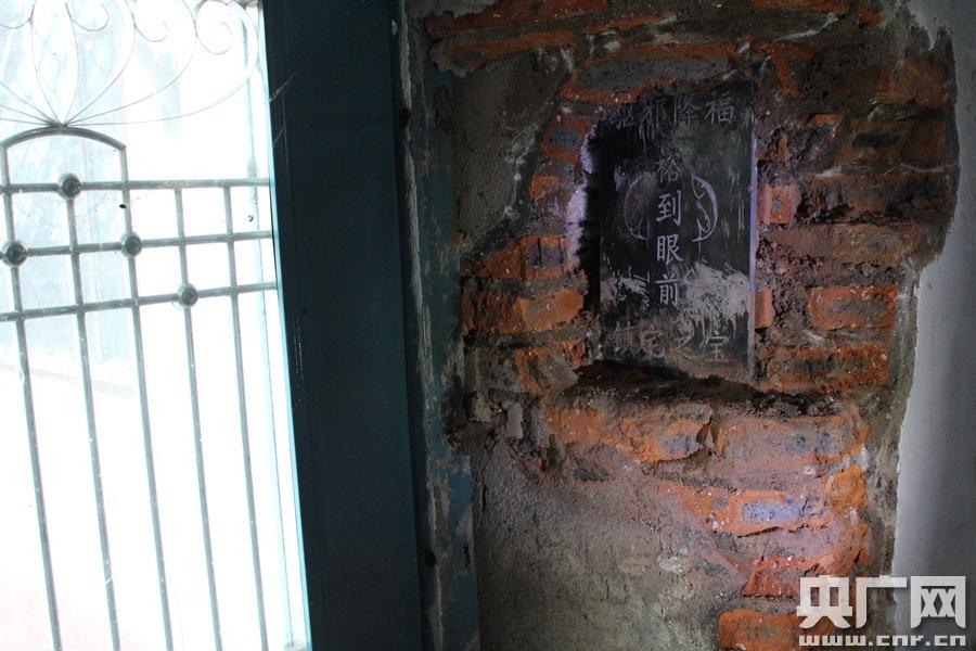 在当地居民指引下,记者发现在该市尚志大街上一栋废弃建筑物的后门东墙垛处被剥开一角,内有一块黑色磨光薄石板裸露出来,该石板大约高30厘米、宽20厘米,板上字迹清晰可见,正面写有“驱邪降福”、“裕到眼前”、“镇宅之宝”等字样,背面则无法看清。