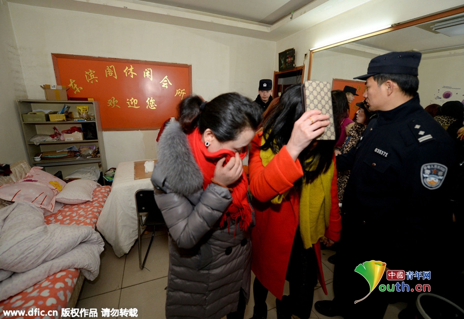 2016年1月11日,中国北京,记者跟随东坝派出所的民警,到辖区内的东风村,对村内的足疗店、发廊等黑开场所(没有营业执照、没有从业资格的发廊、足疗店、歌厅、网吧等场所)展开突击检查,共关停两个涉嫌卖淫嫖娼的黑开场所,带走5女1男配合调查。据了解,为遏制年底警情高发态势,维护朝阳区良好治安秩序,朝阳警方此次集合优势警力,对流动人口聚居、治安形势复杂的东坝、平房等11个重点地区开展清理整治行动。图片署名:京华时报-东方IC