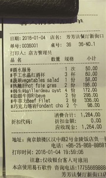 马先生网上自述,今年1月4日晚,与友人在南京金陵饭店负一楼的芳芳法餐厅就餐。当晚朋友过生日,将收到的生日礼物中的一瓶红酒取出,准备在餐厅饮用。服务生见后,表示要另收取50元开瓶费,马先生没异议。但当服务生拿来三个酒杯后,又说每个杯子要再额外收取20元清洗费。没杯子无法饮酒,马先生只有同意。马先生上传的账单显示,当晚总消费1264元,其中酒水服务1次50元,手工水晶红酒杯3个杯60元。
