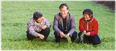 李双星(中)在阜城县德隆农业科技园查看大棚茴香长势。