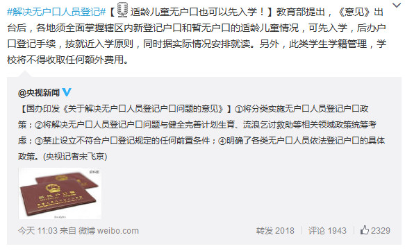 【适龄儿童无户口也可以先入学】教育部提出,《意见》出台后,各地须全面掌握辖区内新登记户口和暂无户口的适龄儿童情况,可先入学,后办户口登记手续,按就近入学原则,同时据实际情况安排就读。另外,此类学生学籍管理,学校将不得收取任何额外费用。