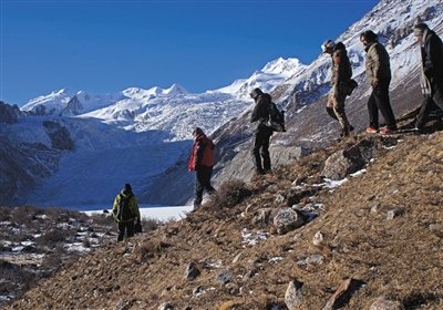 一条弯曲起伏的土路尽头,银光闪闪的冰川面耀眼夺目。在距离冰川大约6公里,有几户藏族牧民的花岗岩房屋,牧民拥加告诉记者,牧民的祖辈们会给有些冰川命名,眼前的是焫茸冰川,冰川下面的湖泊,称为焫茸湖。图为科考人员在当地牧民的协作下,进入冰川进行考察。