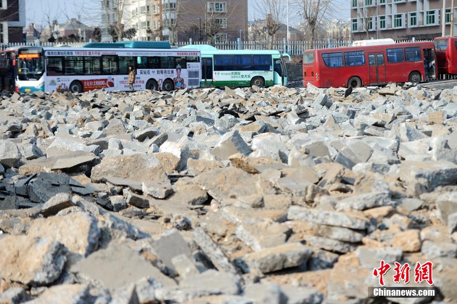 济南一停车场路面被砸成碎片 80辆公交车停路边