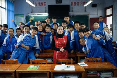 贵阳白云区第三中学教师刘芳和上心理辅导课的学生们一起合影(2015年10月27日摄)。新华社记者刘续摄