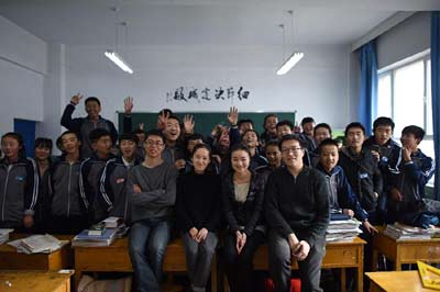 在青海西宁,清华大学研究生支教团成员包逸达、毛雯芝、王媛媛、张本奇(前排从左至右)和湟中一中高一3班学生合影(2016年1月6日摄)。新华社记者张宏祥摄