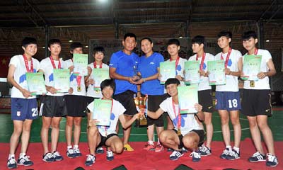琼中女足队员们在夺得U12青少年女子五人制锦标赛冠军后与琼中中学体育教师肖山夫妇合影(2015年8月10日摄)。新华社记者杨冠宇摄