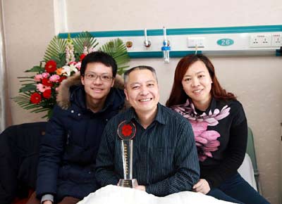 山东聊城市东昌区人民检查院检查官念以新在捐赠完造血干细胞后和家人在病房合影(资料照片)。新华社发