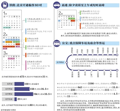 记者昨日从北京市2016年春运工作动员大会上了解到,2016年春运从1月24日开始,至3月3日结束,共40天。铁路客运高峰预计出现在春节前三天。高速路今年春节假日期间继续实施小客车免费通行政策,出京车流高峰预计出现在除夕凌晨至上午。