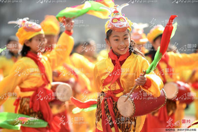 1月19日,安徽省合肥市瑶海区第55中学琥珀名城学校举行“迎新春”传统腰鼓展演活动。活动中,孩子们穿戴着“金猴”服饰和脸谱开心地打腰鼓,迎接猴年新春的到来。