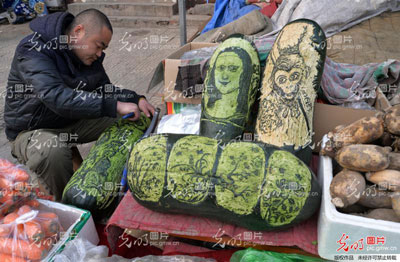 在河北省邯郸市人民路和东风路交叉口的菜市场里,有一位“卖菜大叔”别出心裁地将画刻在冬瓜、西瓜等瓜菜上,引得路人驻足观赏,啧啧称赞。这位“卖菜大叔”叫郭玉红,今年41岁,从2013年开始雕刻“美术瓜菜”。图为1月20日,郭玉红正在冬瓜上刻画。
