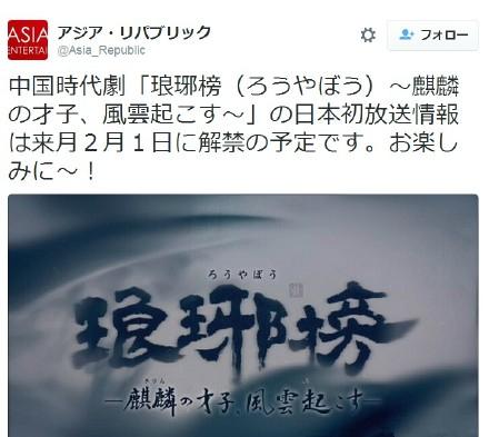 近日,有媒体报道,电视剧《琅琊榜》将在日本播出,日本版剧名定为《琅琊榜(ろうやぼう)~麒麟の才子、風雲起こす~》。据报道,日本版《琅琊榜》将采用中文原声配日文字幕的方式播出。具体播出消息将于2月1日公布。