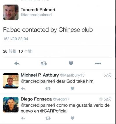 北京时间1月20日消息,据意大利知名记者帕尔梅里透露,有一家中国俱乐部和哥伦比亚球星、现效力于英超切尔西的中锋法尔考进行了接触,但没有透露这家中国俱乐部的名称。法尔考目前还在养伤阶段,身价约为3500万欧元。
