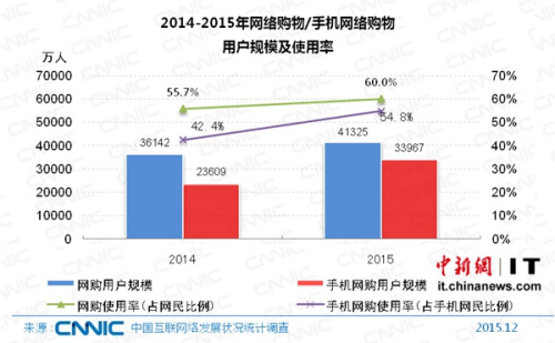2014-2015年网络购物/手机网络购物用户规模及使用率。