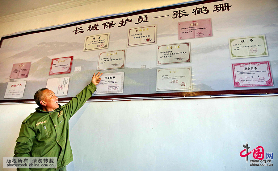 “长城守护员”张鹤珊介绍他的获奖证书。