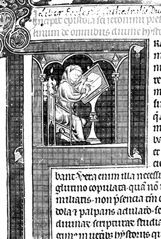 杜伦修道院的其中一份手稿,描绘修士在抄写的样子