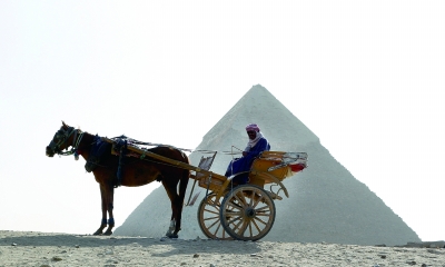 在开罗的中国文化中心工作的阿拉伯雇员阿巴斯,来这儿工作前,当了六年中文导游,接待了多少中国游客他也数不清了。近些年,到埃及旅行的中国人越来越多,两个文明古国有了更多的交流和了解。金字塔是游客去得最多的地方。金字塔下,小商贩牵着高大的骆驼和披挂着鞍具的驴马,热情地招呼着刚刚抵达的游人。想想在酷热的沙砾上行走的艰难,游人们大都会选择骑坐在骆驼或驴马上,在商贩的引领下游览金字塔。阿拉伯头巾、衣物和用当地水果现榨的果汁,也颇受游人青睐。