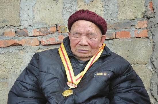 2016年1月16日,阳光和煦。金堂县隆胜镇黄桷桠村公路旁,有间年久失修的老房子,泥土筑起的墙已剥落大半,地面坑洼不平却打扫得很干净。94岁的唐文光坐在院坝里,晒着太阳眯了一觉醒来。