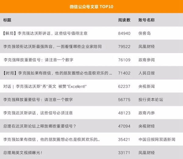 去年年初,李克强总理到访瑞士小镇达沃斯参加世界经济论坛,新榜统计发现,跟总理2015年瑞士之行有关的微信公众号推文共有838篇,总阅读数超过190万。