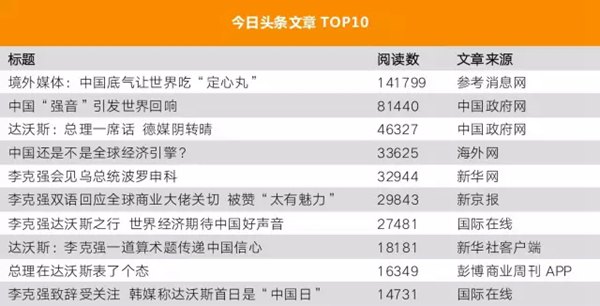 今日头条上的冠军文章是来自参考消息网的《境外媒体:中国底气让世界吃“定心丸”》,该文汇集了海内外多家媒体对总理论坛发言的正面反馈,让看过这文章的14万人感到骄傲。