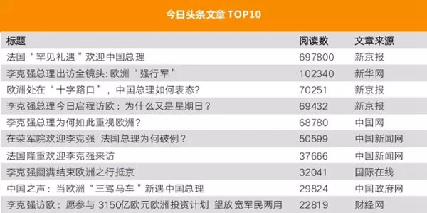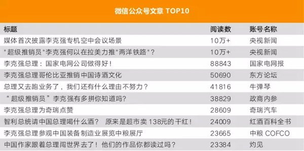 据新榜统计,总理年中的法国之行并没有产生10万+的“爆款”微信公众号推文,在阅读数TOP10中,主流时政媒体与行业新媒体平分秋色。