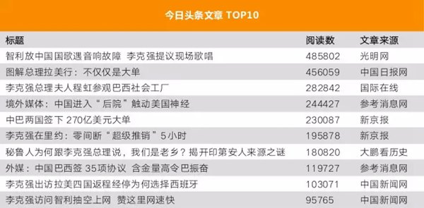 今日头条上阅读数最多的文章是《智利放中国国歌遇音响故障 李克强提议现场歌唱》,阅读数近50万,机智如总理啊!大家自行脑补现场情形……