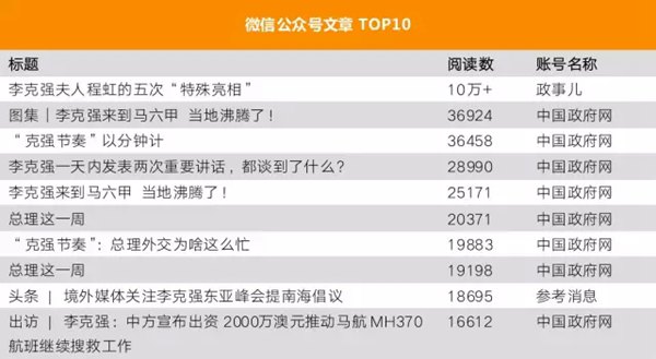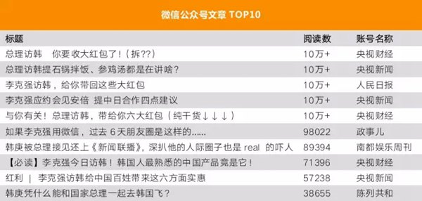 应韩国总统朴槿惠邀请,克强总理于10月最后一天前往“邻居”家串门,为期3天的访韩,共有656篇微信公众号文章参与报道,总阅读数超过188万,10万+的有5篇。