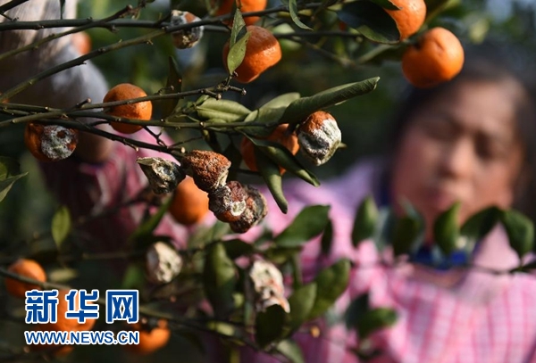 在广西兴安县界首镇兴田村,一名村民查看烂在果树上的蜜橘(1月24日摄)。新华社记者 陆波岸 摄