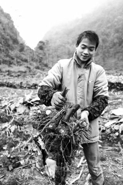 1月13日,在广西马山县里当乡雅联村内仁屯,笔者看到去年种下的“南藕一号”多数都已采收,还剩少部分在田地里没开挖。一块旱地里,几个村民在帮一户人家挖旱藕。这块地的主人说,正在采收的就是“南藕一号”,比起以前他们种的老品种个更大,块茎多,产量高出很多。