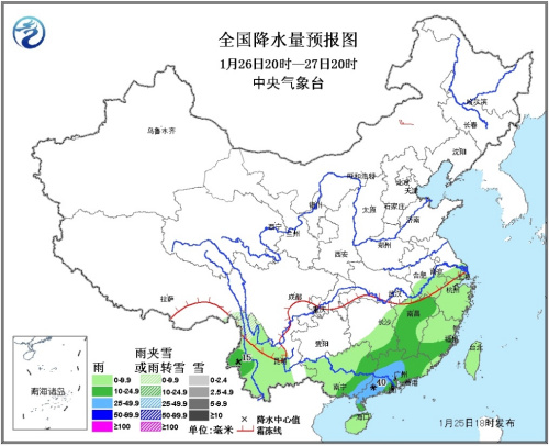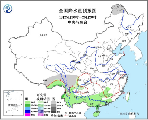 25日20时至26日20时, 内蒙古东北部、黑龙江西北部、西藏东部、川西高原、云南西北部等地的部分地区有小雪或雨夹雪;西藏东南部、云南大部、广西大部、湖南南部、江西南部、广东西南部、海南等地的部分地区有小雨,局部中雨。内蒙古中部有4~6级风。巴士海峡、南海北部海域有7~8级、阵风9~10级的东北风。