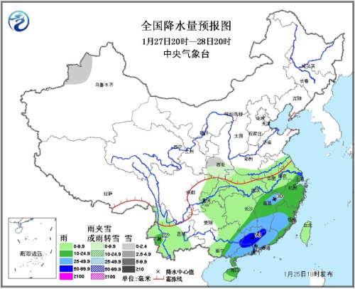 27日20时至28日20时,新疆西北部、陕西南部、云南西北部等地的部分地区有小雪或雨夹雪;云南中西部和南部、四川盆地东部、重庆、贵州中东部、黄淮南部、江汉、江淮、江南、华南大部、台湾等地有小到中雨或阵雨,其中,江西东北部和南部、广东大部、福建中南部、湖南东南部、广西东部等地的部分地区有大雨,局地有暴雨(50~90毫米)。山东半岛、辽东半岛等地有4~6级风。