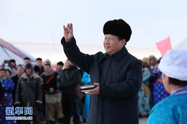 这是2014年1月27日,在锡林浩特市宝力根苏木(乡)冬季那达慕“五畜祈福”仪式上,习近平按照蒙古族习俗,用无名指蘸上银碗盛着的鲜牛奶弹了三下,祝福来年风调雨顺,五畜兴旺,人民幸福安康。新华社记者 庞兴雷 摄
