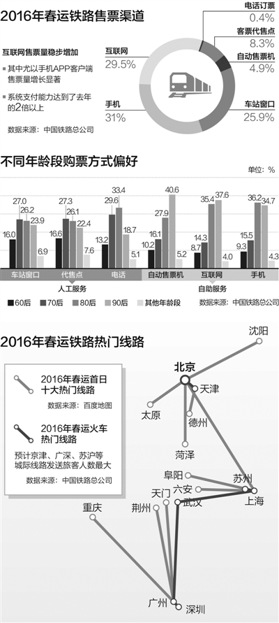 互联网日均售票量已从2011年开通之初的60万张达到2015年的近450万张,移动客户端又是增长最快的售票渠道。铁路12306APP客户端成为最热门的手机客户端之一。春运期间,日均手机售票量从2015年的115.1万张提升到今年的275.4万张,增长了近1.4倍;高峰期手机售票从160.5万张提升到376.2万张,增加了1.3倍。2016年春运,手机端售出的票占比从2015年的14.2%提高到31%。系统支付能力达到了去年的两倍以上。