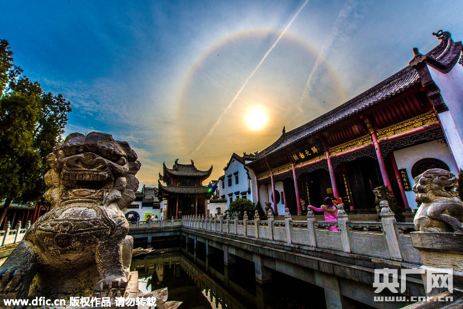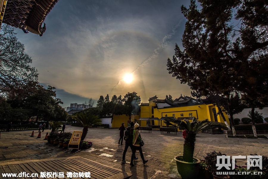 2016年1月26日,湖北武汉归元寺天空中上演日晕奇观,日晕光环与寺院大佛、建筑相得益彰,简直美爆了朋友圈。