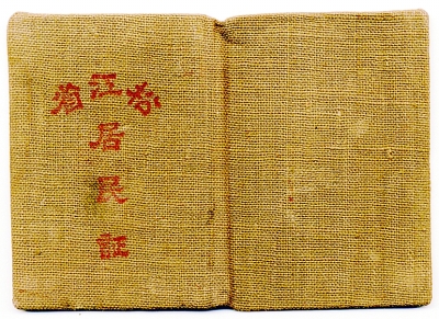 这个居民证,制作很结实,装裱也很精致。硬板纸做底,外用绿布贴包,封面是红色烫金六个大字:“松江省居民证”。长二十六厘米,宽十八厘米。