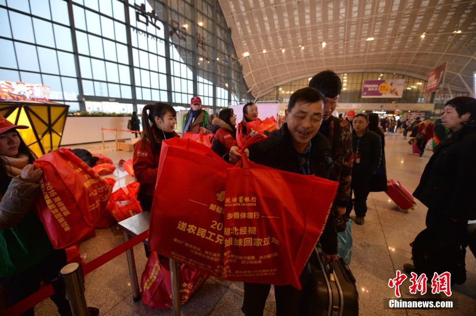 1月30日,由湖北省总工会、共青团湖北省委、湖北省妇联、武汉铁路局共同举办的“送农民工兄弟姐妹回家过年”爱心专列D5996次动车从武汉火车站启程,满载着600多名农民工兄弟姐妹踏上返乡的旅程。图为返程农民工领取爱心礼包。 中新社记者 张畅 摄
