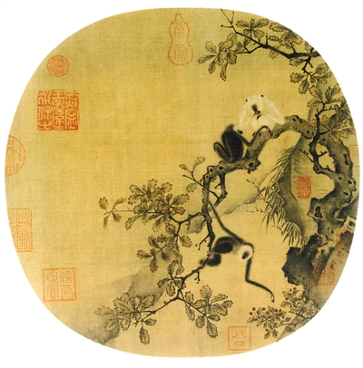 故宫博物院藏宋代中国画《猿猴摘果图》。