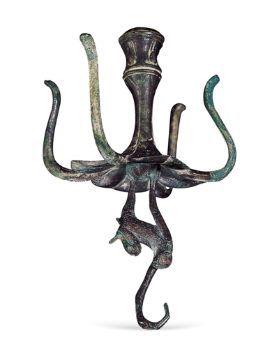 河北博物院藏西汉青铜器《花形悬猿铜钩》。