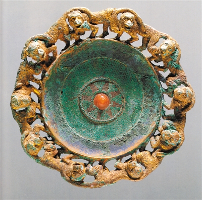云南石寨山滇人墓出土《鎏金铜扣饰》。