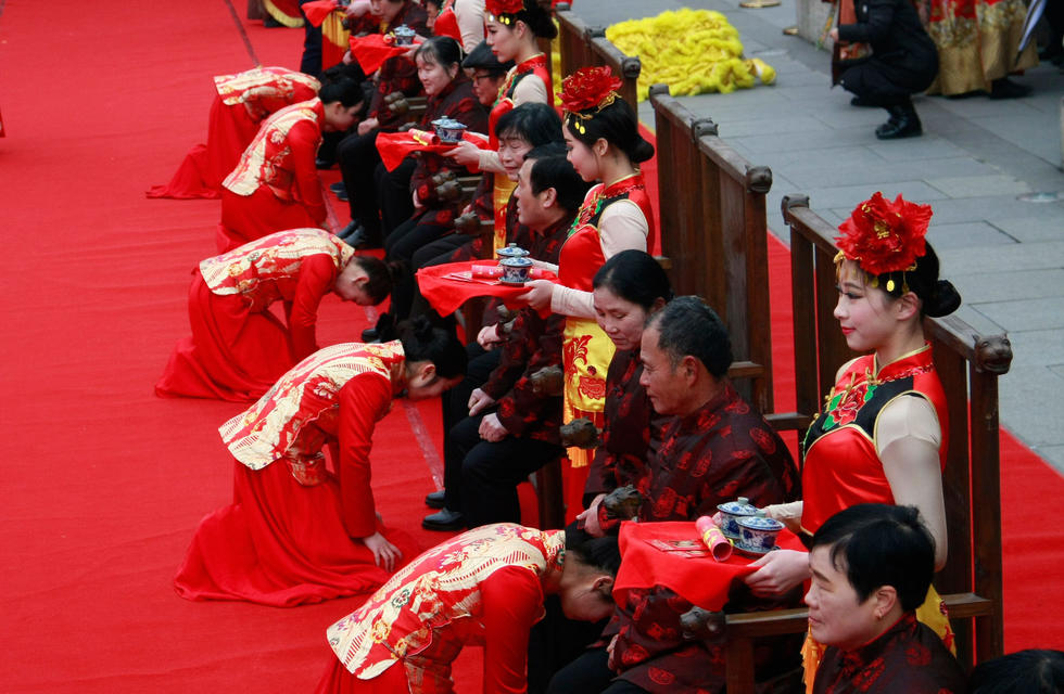 1月31日,杭州,小年夜前一天,一单位12位员工跪拜自己的父母,行传统拜年礼仪,并发给父母过年压岁钱。据主办方称,此次活动是为了提倡传统孝道,感谢父母多年的养育之情。
