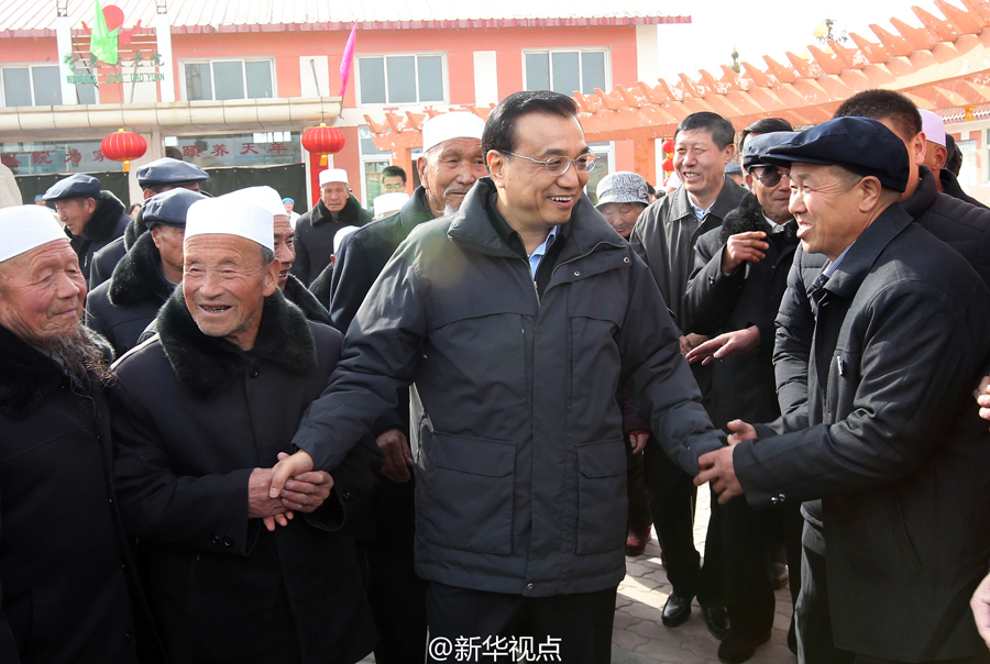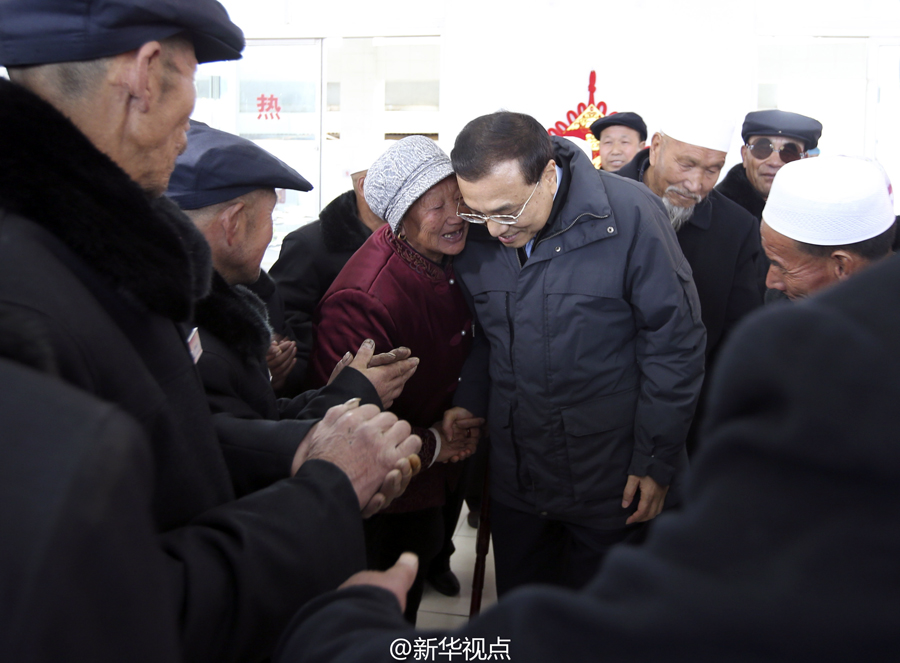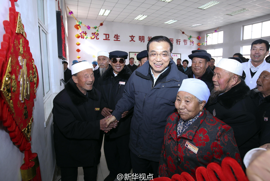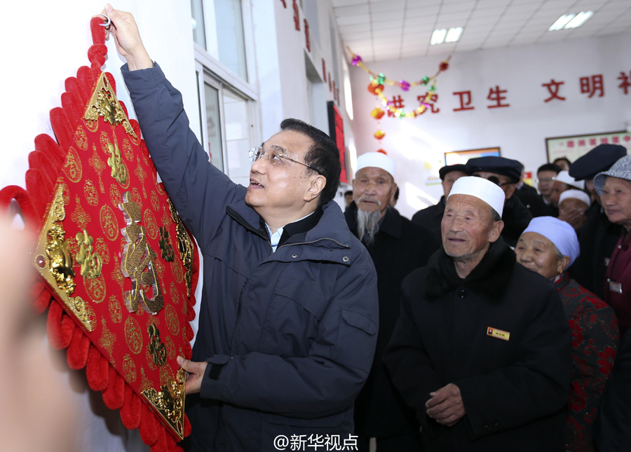 李克强1日来到宁夏固原市原州区中心敬老院,给老人们带来年货大礼包。他说,今天是农历小年,在春节这个中华民族重要的节日里,我们不能忘记老人。我代表党中央、国务院给你们带来礼物,最重要的是这两个字——说完他亲手把“福”“寿”挂件挂在墙上。