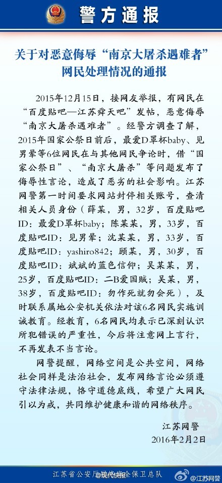 去年国家公祭日前后,有网民在网上发表恶意侮辱“南京大屠杀遇难者”的言论,江苏警方及时封号处理。今天(2日),江苏省公安厅网络安全保卫总队官方微博发布通报,公布了对这些网民的处理结果。6名恶意侮辱“南京大屠杀遇难者”的网民被警方训诫教育。