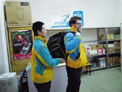 2月1日,慈云寺,来自英国的弗兰克(右)背上装有快递货物的背包,体验快递员工作。 本组图片/新京报记者 王嘉宁 摄
