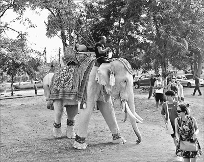 去年12月25日,在泰国中部大城府古城,游客观赏大象表演。