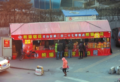 3日上午,朝阳区三里屯附近一家熊猫烟花销售点,猴年烟花爆竹新品全部摆上货架,不少市民在销售点外询价购买。