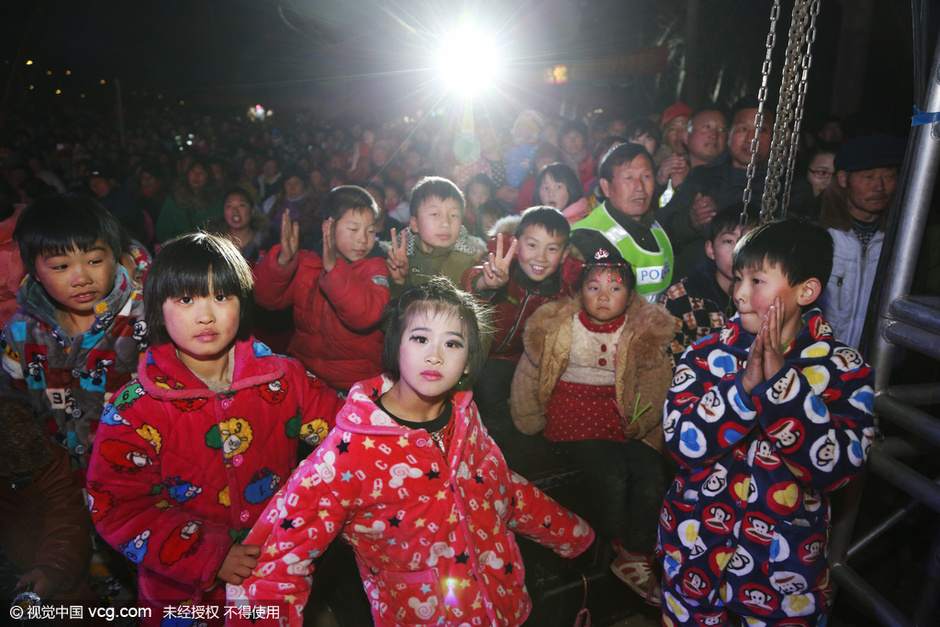 “哈哈哈……”台下的兴致一下被带动了起来,几个顽皮的孩子挣脱了大人的手,跑到台前跟着演员们手舞足蹈。