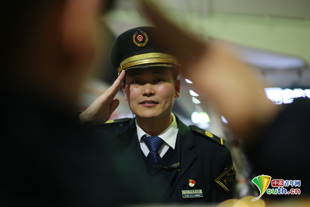 当列车到达兖州车站,列车长王兆胜与兖州站值班员赵鑫两人一个标准的敬礼,完成了安全、责任和任务的交接。中国青年网通讯员 郭旭 摄