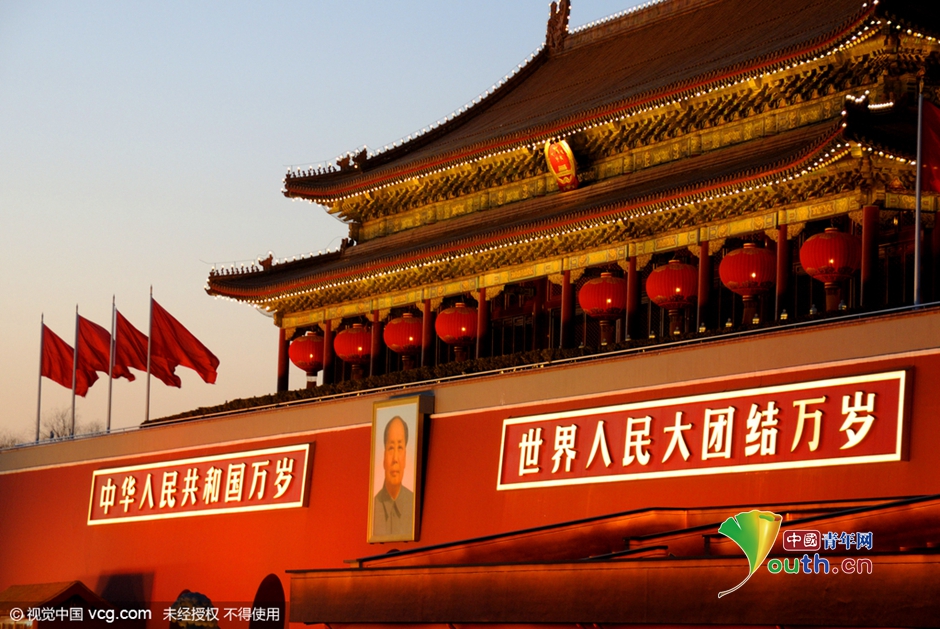 2016年02月06日晚,北京春节景观照明开启,天安门广场及长安街夜色璀璨,喜迎猴年新春。天安门城楼悬挂起大红灯笼,夜色璀璨。图片作者:金闻/视觉中国