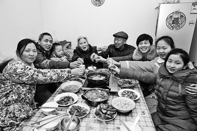 “四世同堂的一家人正准备吃团年饭,螃蟹、鱿鱼、炖鱼、炖肉、炖鸡、炒蒜苗摆满了一个大圆桌,热气蒸腾。”这是千年古村北京市朝阳区高碑店村村民王希如家的年夜饭,春节前夕,记者韩寒走进他家,体验“总面积450平方米的三层小楼明亮温馨”。
