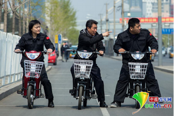 张惠领(中)带领队员在街头巡逻。 北京市公安局供图
